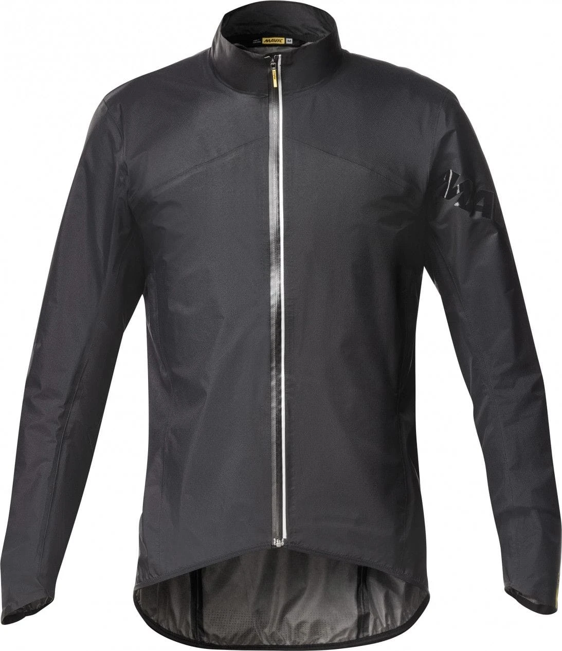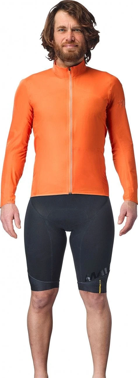 Protect yourself from passing storms with a lightweight jacket that’s totally waterproof and packs down easily into a jersey pocket. Most rainjackets are bulky. They might protect you from the weather, but when the sun comes back out then you’re stuck carrying them. The Cosmic H20 Jacket is different. It offers waterproof protection and still packs down easily into a jersey pocket. Designed for gran fondo and sportive racing and training, this is a jacket that you can always carry when riding in alpine environments, where the weather can turn quickly, or in changing seasons like fall and spring. It weighs just 110 grams (size medium) and fits easily into a jersey pocket when packed down. Even with its superlight construction, the Cosmic H20 Jacket still offers total waterproof protection. Its 2.5 layer fabric features a durable woven outer shell with a polyurethane membrane that blocks out rain and road spray. We made this jacket with a close-to-the-body “Pro Fit” that doesn’t flap in the wind. The sleeve shape is optimized for an aggressive riding position, and an ergonomically designed cuff fits snugly on the wrist. All the seams are fully sealed, and the extended tail shields you from rear tire spray. Lastly, we added integrated reflective print for improved visibility in low-light conditions. No reason to let stormy weather stop you from riding. Now you’re ready for anything. Portable protection from rain and storms. Weighs only 110g (M size) and it folds into half a jersey pocket. Stay dry and comfortable in wet, stormy weather. The 2.5 layer fabric features a durable woven outer shell with a waterproof polyurethane membrane rated at 10K WP (5K MVTR). “Pro Fit” so you slice through wind faster. Body-hugging fit prevents fabric from flapping in the wind.